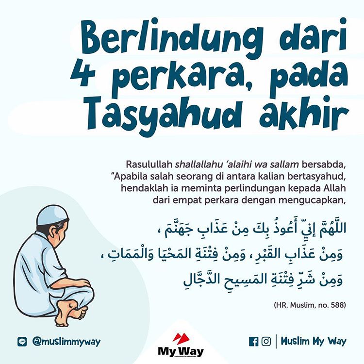 Artinya: Ya Allah, sesungguhnya aku berlindung kepada-Mu dari siksa neraka Jahannam, dari siksa kubur, dari fitnah kehidupan dan kematian, dan dari kejahatan fitnah Al-Masih Ad-Dajjal.” (HR. Muslim, no. 588).